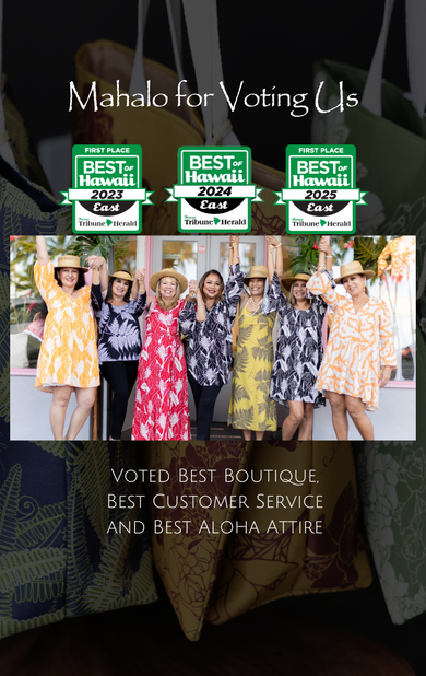 The brand’s contemporary aloha wear is influenced by the Hawaiian culture through various local prints and the tropical beauty and enjoyments of the island of Hawai’i.