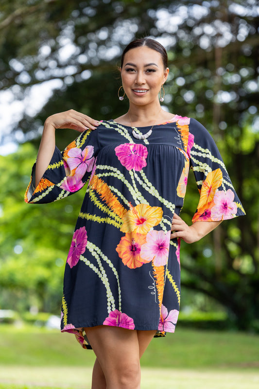 This cute baby doll dress has a unique silhouette that adds a touch of charm to any outfit. Made with woven bamboo/rayon.